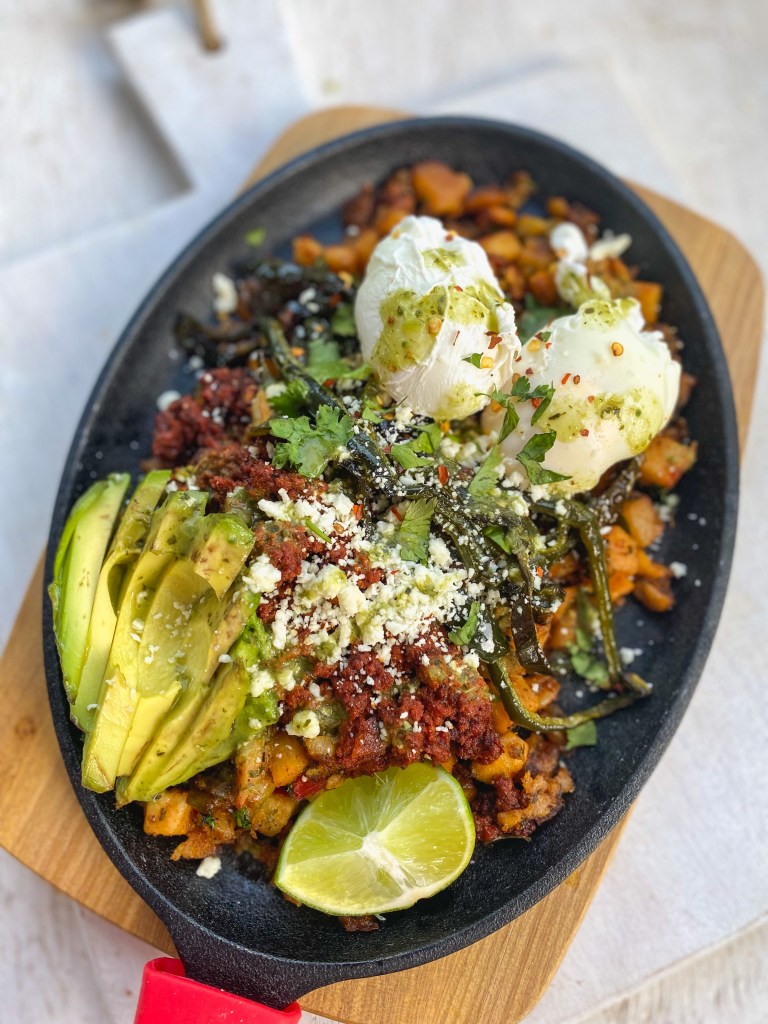 - Assemble your plate. Start with a base of potatoes before adding the chorizo and poblanos. I used individual fajita skillets for serving this dish, allowing the option to place the potatoes, chorizo and peppers in the oven to stay warm while cooking the eggs. You can simply wait to assemble until the eggs are done or keep your plate warm by placing oven-safe dishes in a warmed oven (200°).