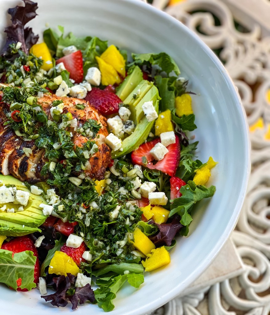 One thought on “Strawberry Mango Salad with Grilled Chili Lime Chicken & Cilantro Chimichurri Dressing”
