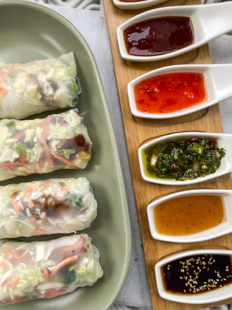 - When the chicken and rice noodles are ready, assemble the rolls. Moisten the rice paper and lay flat on a nonstick surface. Add a layer of the Asian chopped salad mix, topping with chicken and rice noodles. Roll tightly and set aside. Repeat until you run out of filling.