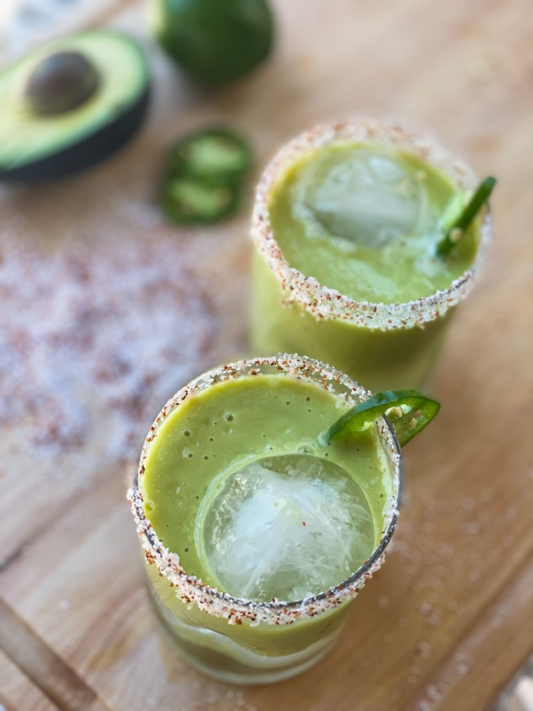 - In a blender, add coconut water, syrup, avocado and jalapeño slices. Squeeze in the juice from the lime and set rind aside.