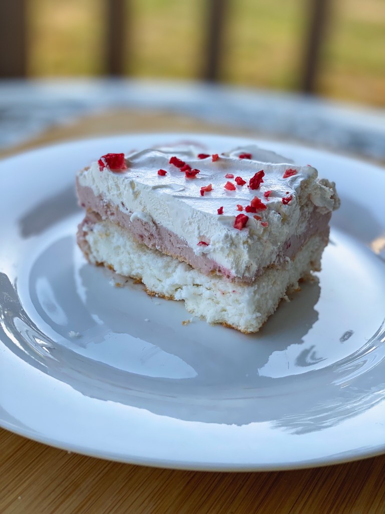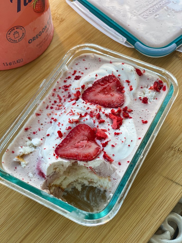 - In a freezer safe container, start with a base layer of thinly sliced angel food cake. Add a layer of softened strawberry ice cream and top with a couple of fresh strawberry slices and more small pieces of cake.