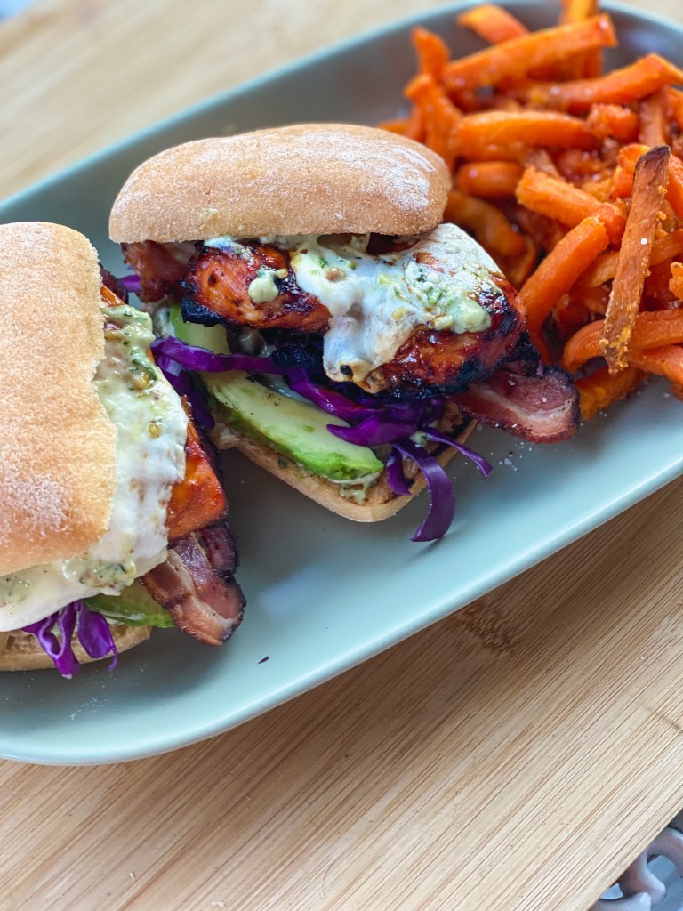- When the chicken is done, quickly toast the ciabatta on the top rack of the grill. Assemble the sandwiches beginning with a generous spread of the pesto aioli. Add sliced avocado, bacon and shredded cabbage before carefully topping with the grilled chicken. Add some more pesto aioli to the top bun before serving with your favorite starchy side (like sweet potato fries!).