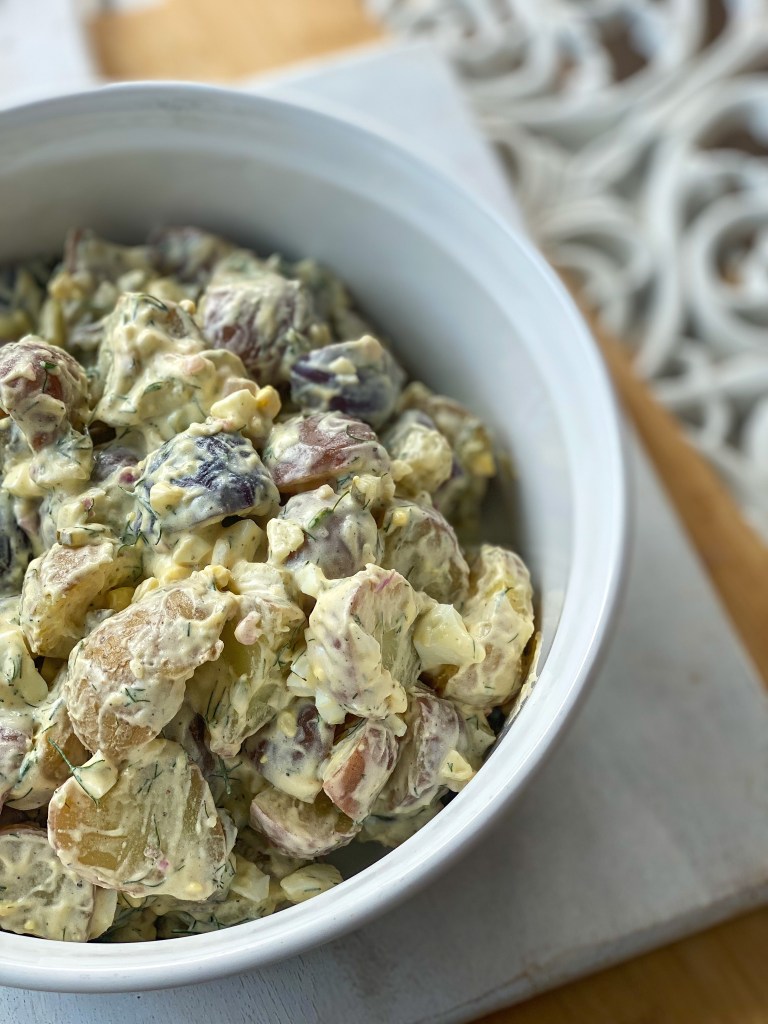 - In a large bowl, combine mayonnaise, mustard, white vinegar, pickles and juice. Add chilled potatoes and fresh dill, mixing until potatoes are coated.