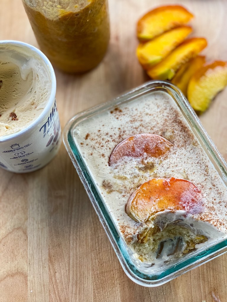 - In a freezer safe container, start with a thin base layer of yellow cake.* Add a layer of the peach sauce. Next, carefully pour in the softened maple pecan custard or ice cream.