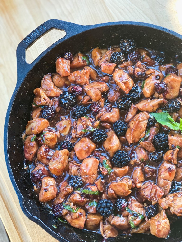 - In the same small bowl, combine cornstarch and cold water to create a slurry. Add the slurry and 1/2 cup of blackberries to the skillet and turn the heat to low. Stir carefully to throughly coat the chicken in the thickening sauce.
