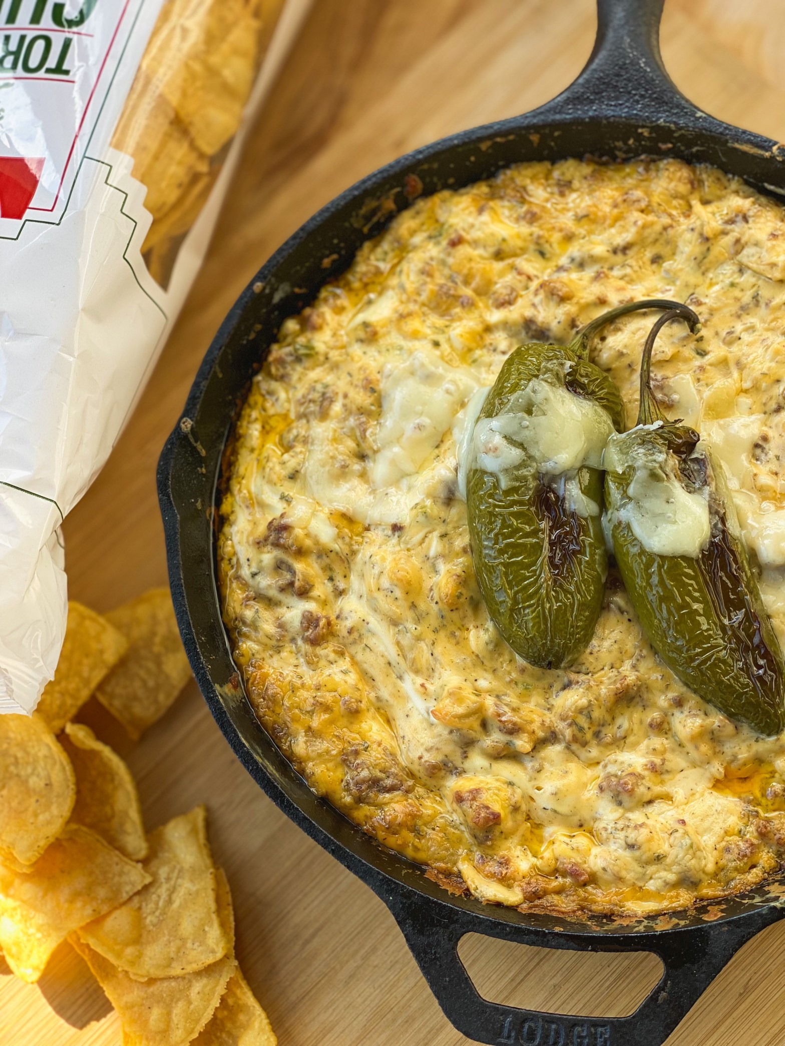 - Start by browning the ground sausage in a large cast iron skillet. Add the diced onions, garlic and 2 tablespoons of diced jalapeños. Stirring often, sauté until the onions begin to caramelize.