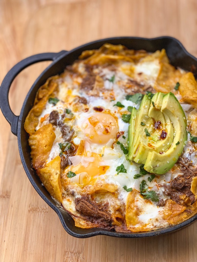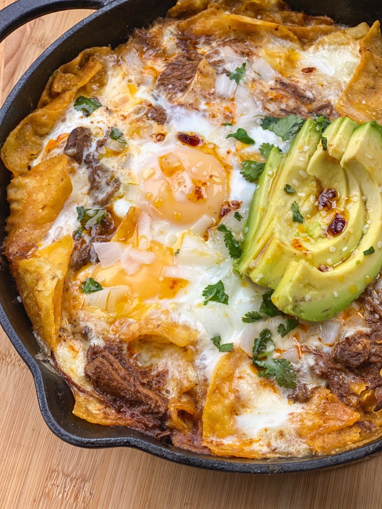 - Heat a large skillet on medium high and add the birria broth. Bring the broth to a simmer before filling the skillet with tortilla chips. Carefully toss the chips in the broth, allowing the majority to be coated. Once tossed, top with a few more chips if needed.
