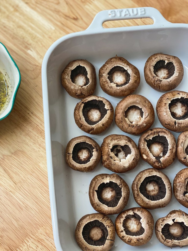 - Prepare the mushrooms by cleaning with a paper towel. Carefully remove each stem, setting aside for the stuffing, and toss each cap in the seasoned olive oil before placing in a baking dish.