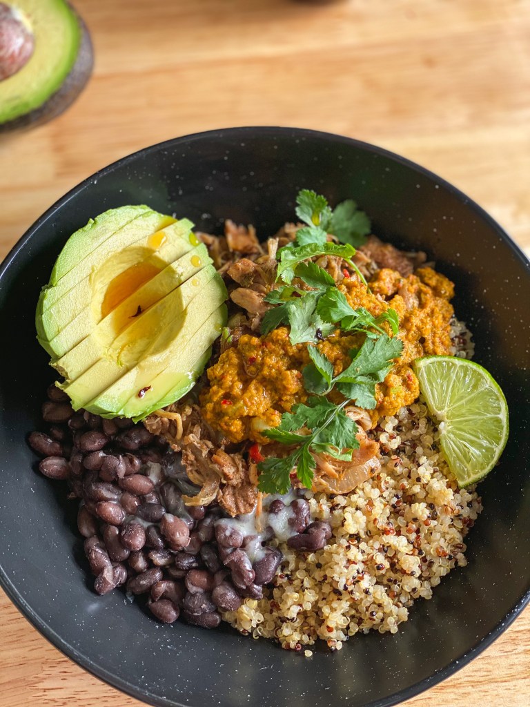 - Assemble the bowls with a healthy scoop of quinoa, beans and top with cheese. Pile on the pork.