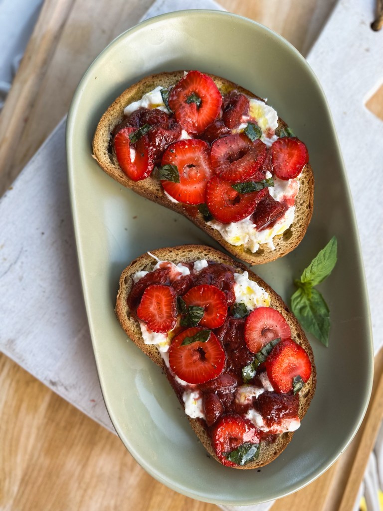 - Halve the burrata on two pieces of gf toast. Spread the mozzarella cream to cover the pieces. Add a healthy helping of the balsamic strawberries before placing the marinated strawberries on top. Drizzle with a little more olive oil and finish with cracked black pepper.