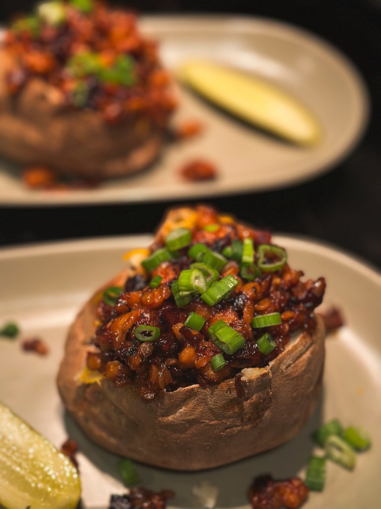 - When the potatoes are done, split them open and add butter, cheese or whatever else you prefer. Top each one with a healthy helping barbecue tempeh mixture.