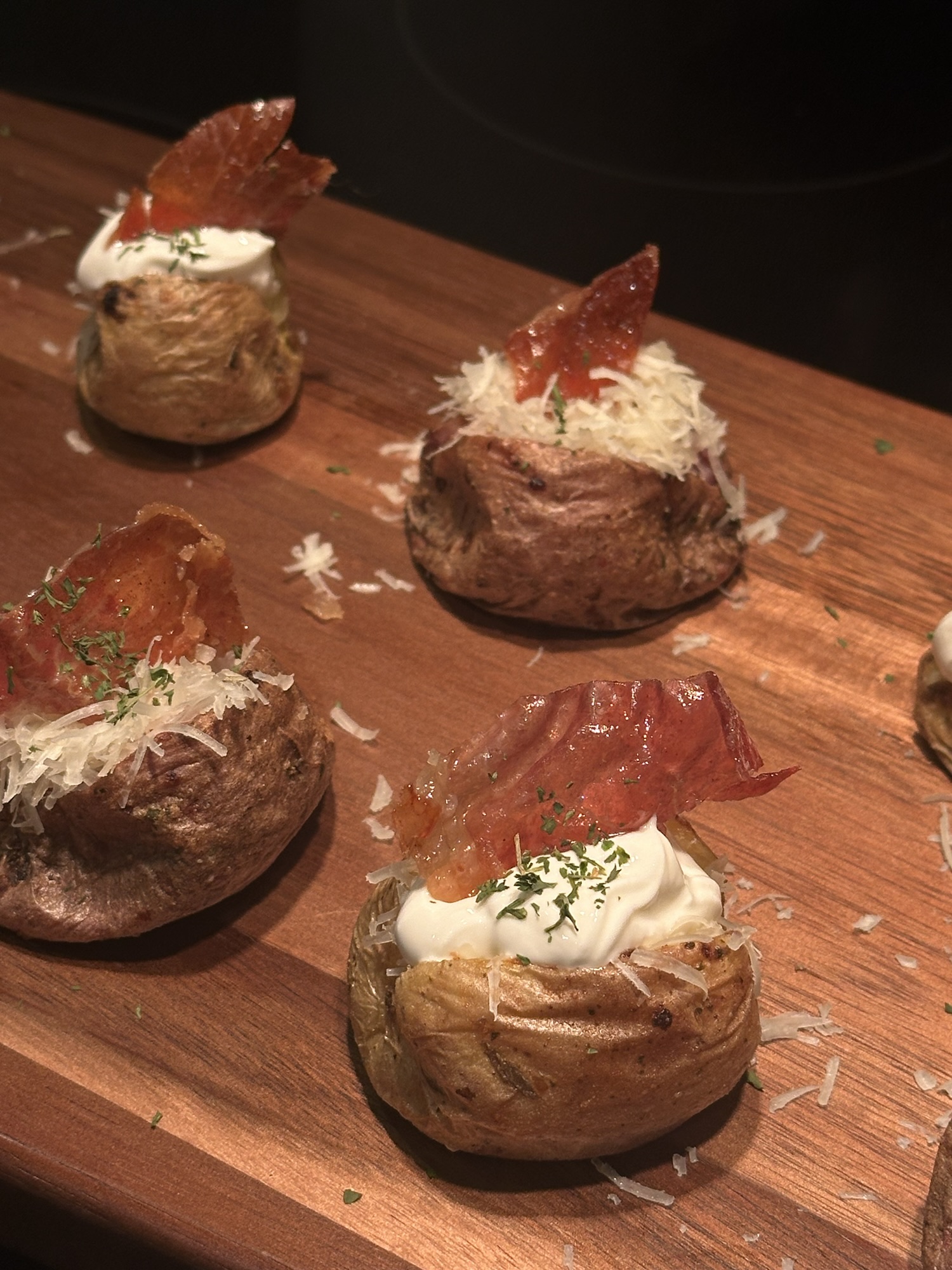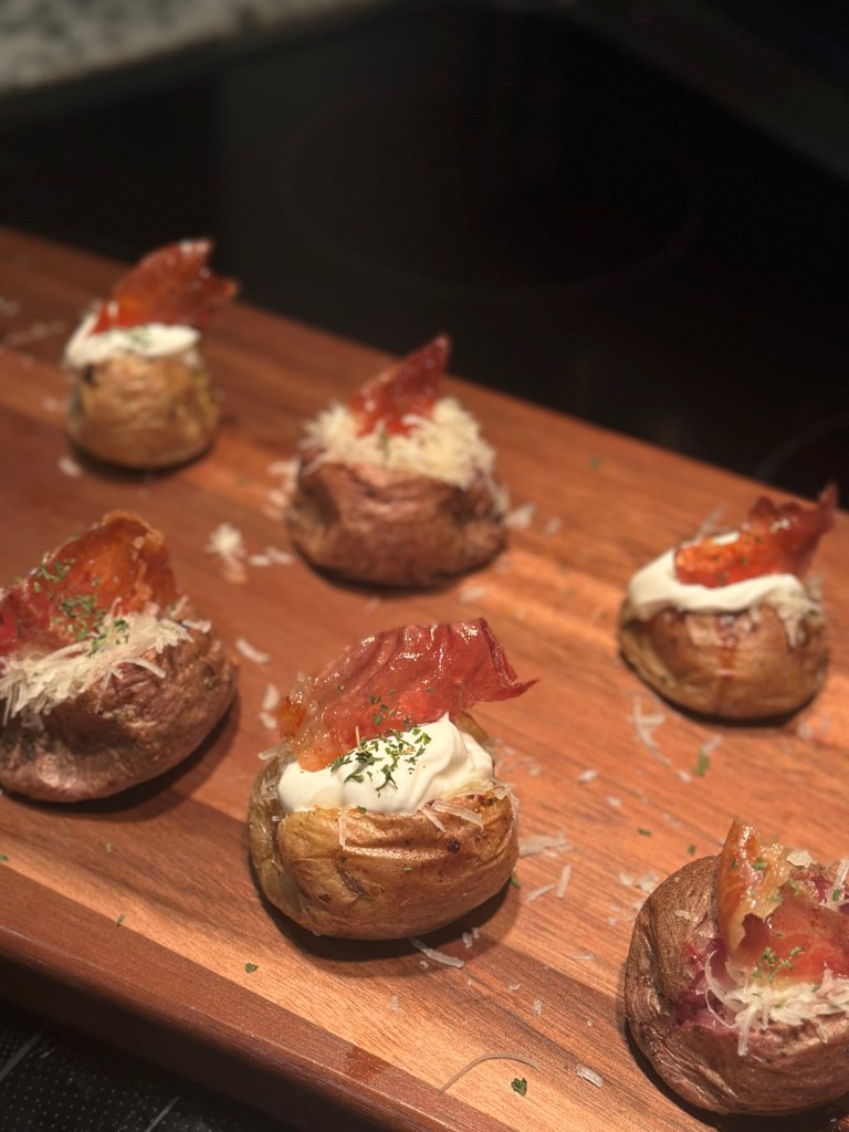 - Top with a dollop of sour cream, a piece of candied prosciutto, and a sprinkle of your herb choice.