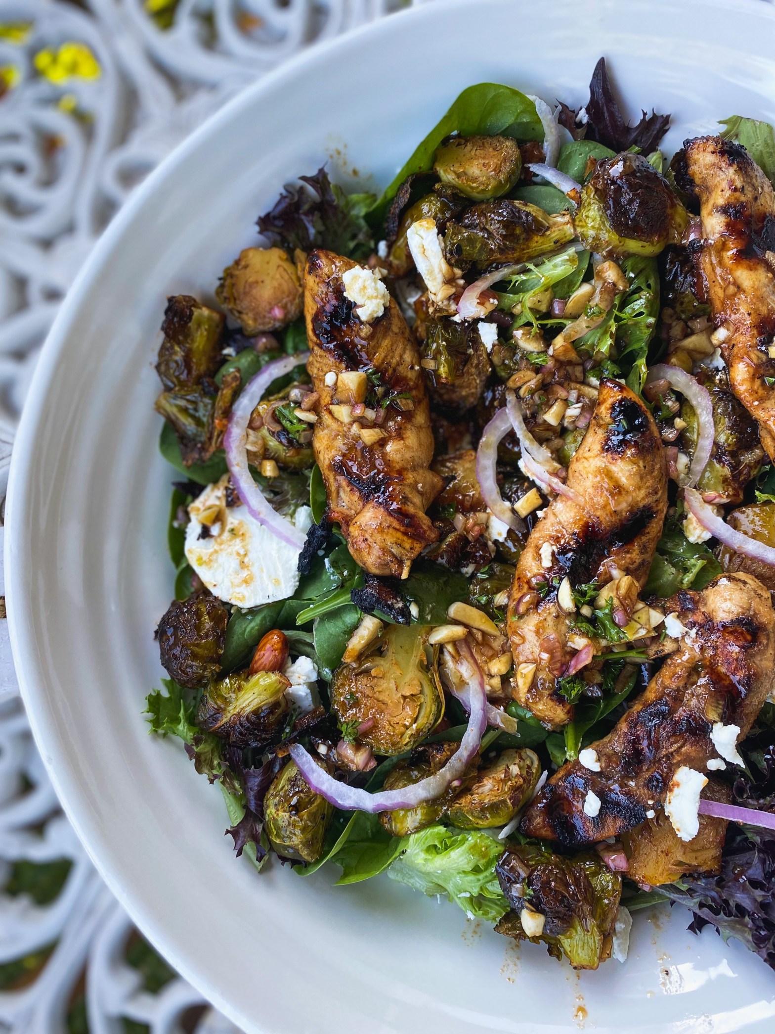 Balsamic Grilled Chicken & Goat Cheese Salad with Fried Brussel Sprouts